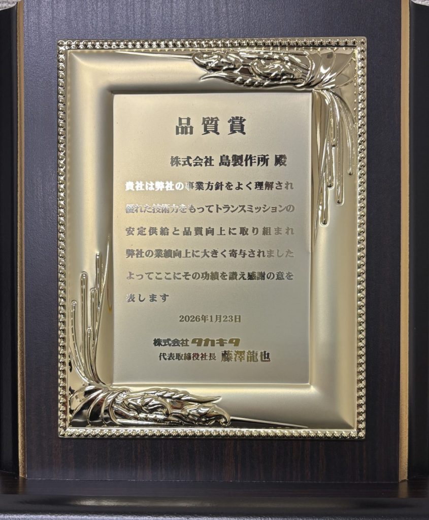 このたび、株式会社タカキタ様より、品質に関する取り組みが高く評価され、**「品質賞」**を受賞いたしました。